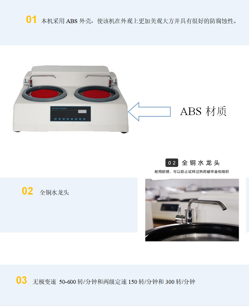 MP-260E型金相試樣磨拋機為雙盤臺式機,適用于對金相試樣進行粗磨、精磨和拋光操作。