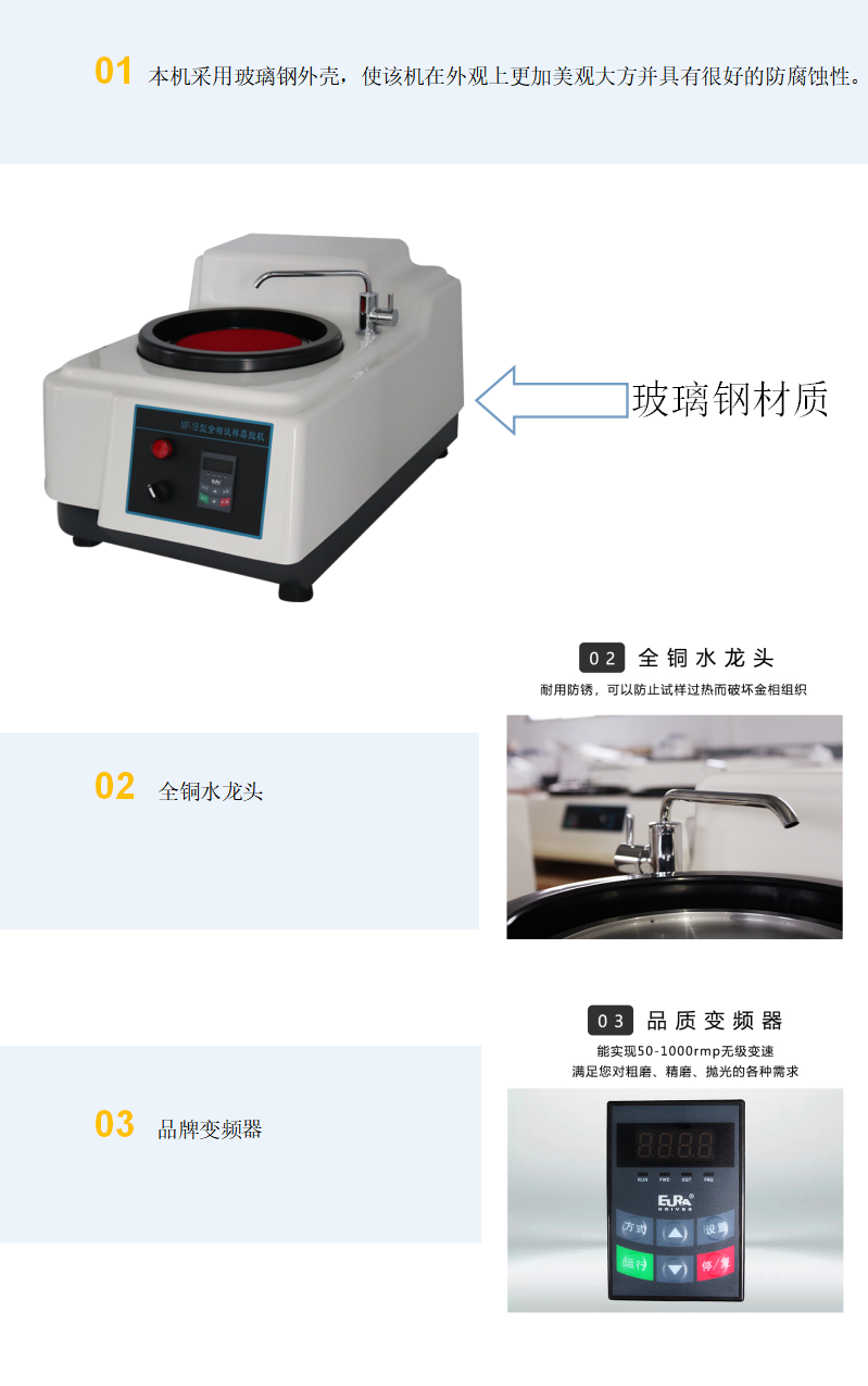 本機通過變頻器調速,可直接獲得50-1000轉/分鐘之間的轉速,從而使本機具有更加廣泛的應用性。是用戶用來制作金相試樣必不可少的設備。
