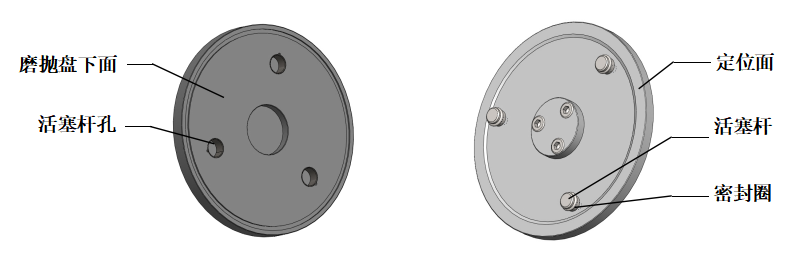 01 磨拋盤(pán)可快速更換,兩手拿住磨拋盤(pán)輕輕上提即可取下來(lái);將另一個(gè)磨拋盤(pán)兩手拿平,目測(cè)磨拋盤(pán)的三個(gè)活塞桿孔與三個(gè)活塞桿基本對(duì)應(yīng)時(shí)落下,感覺(jué)其中一個(gè)孔對(duì)應(yīng)時(shí),輕微擺動(dòng)磨拋盤(pán)使另兩個(gè)也對(duì)應(yīng)后將盤(pán)持平插入,再用手控壓一下,使磨拋盤(pán)下面與磨拋?zhàn)亩ㄎ幻嫱耆佑|。