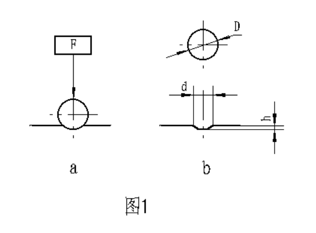 金屬布氏硬度試驗系采用一定直徑硬質(zhì)合金球,以規(guī)定試驗力壓入被測材料表面(圖1a)按規(guī)定保持時間后,卸除試驗力,(圖1b)測量試樣表面的壓痕直徑,以計算出布氏硬度,并以下式計算之: